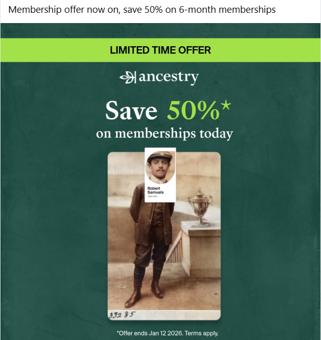 I stumbled across this ad for 50% off Ancestry.ca until 12 January. It’s undoubtedly for “new” subscribers only.